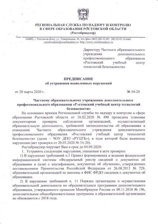 Предписание Ростобрнадзора об устранении выявленных нарушений № 54-20 от 20.03.2020г.