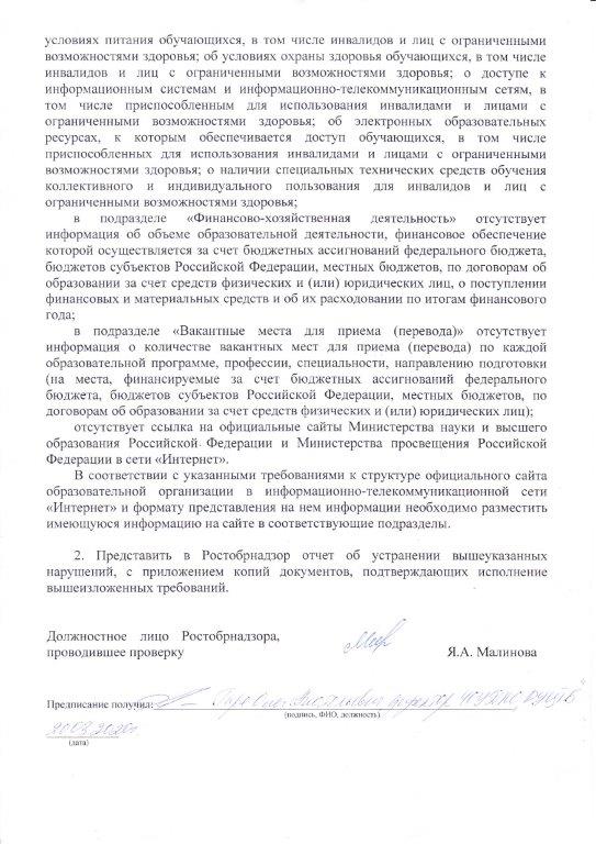 » Предписание Ростобрнадзора об устранении выявленных нарушений № 54-20 от 20.03.2020г.